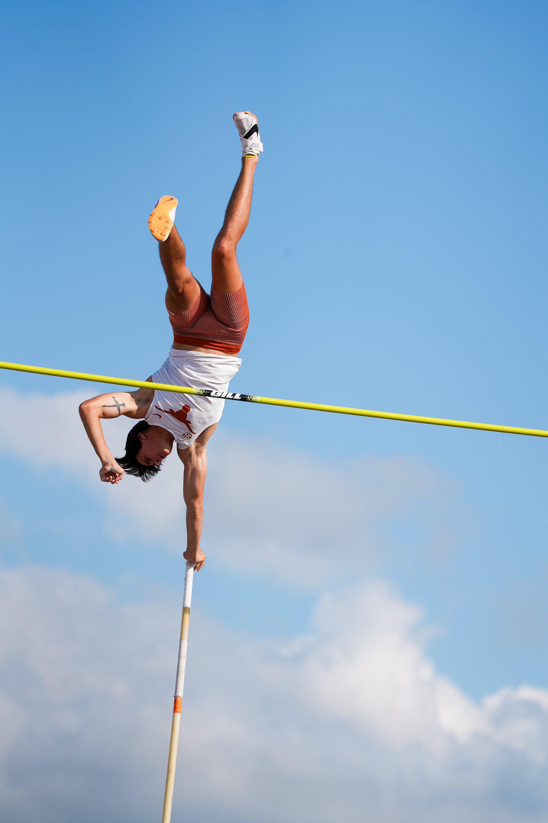 Sam Abati vaults over the bar at the NCAA West Preliminaries held in College Station, Texas, on May 28, 2025.