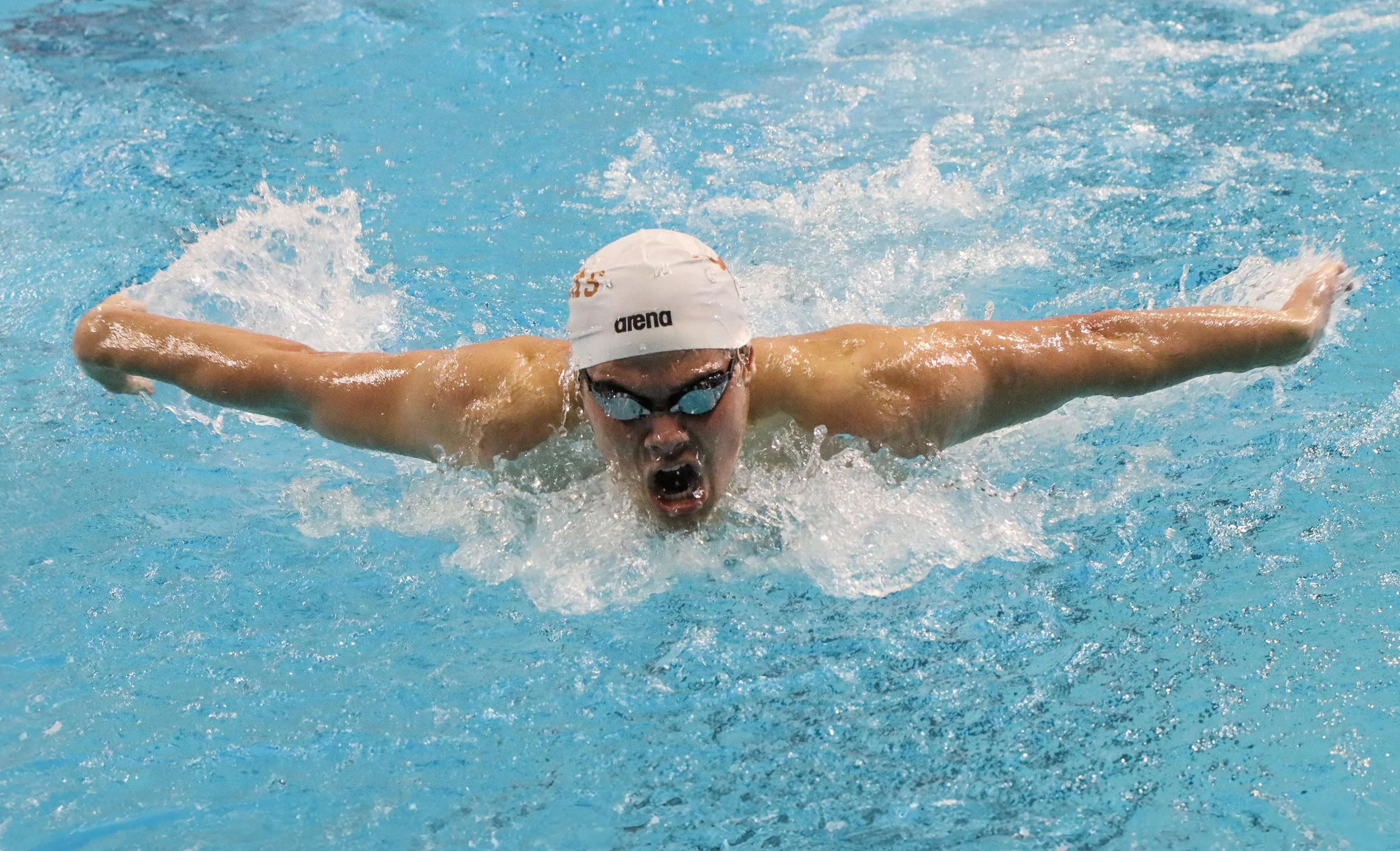 A Texas Swimmer takes a breath while competing in the 200-meter butterfly on Feb. 2, 2024.