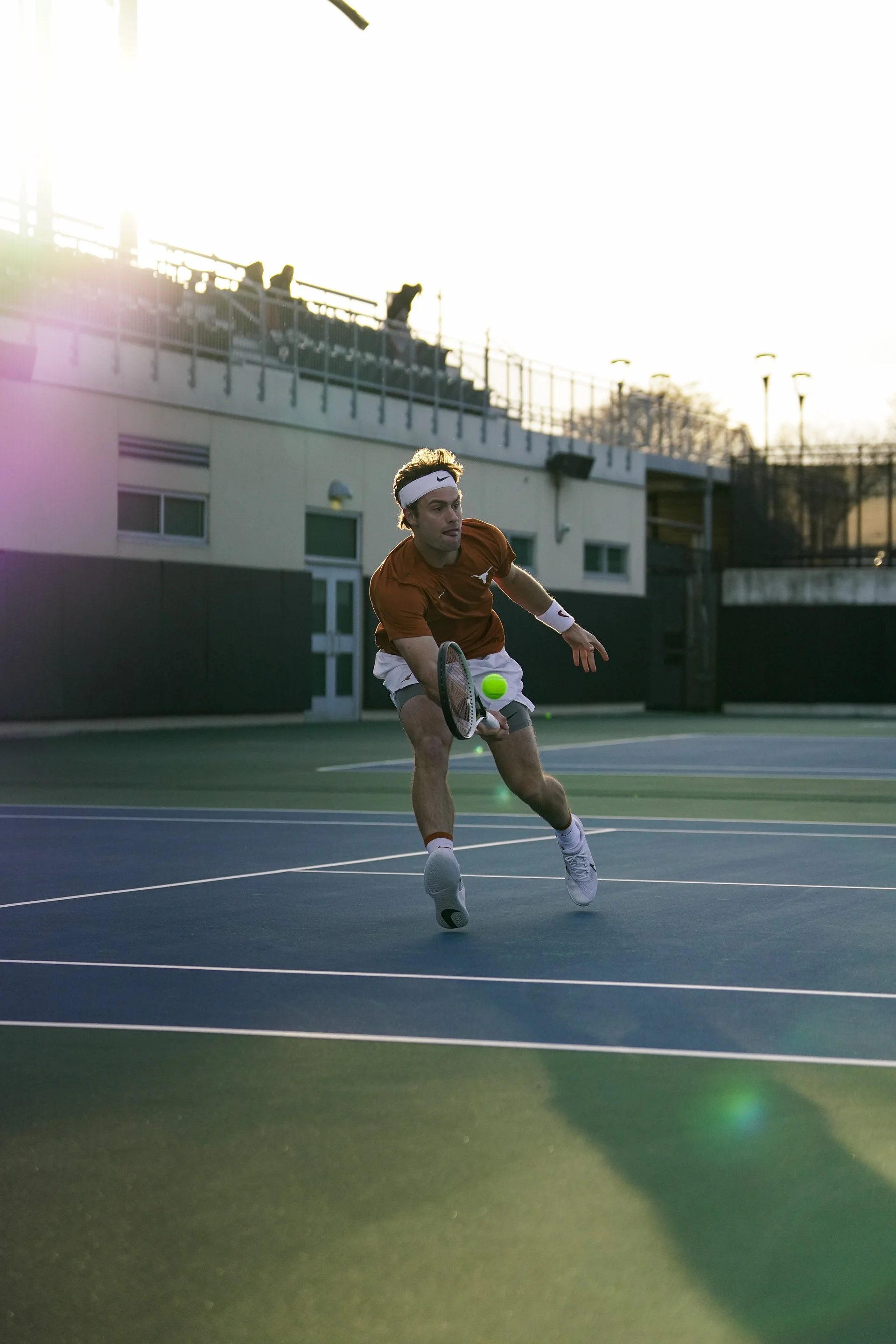 Vivian Ovrootsky crouches down to return the ball on Sunday, March 3, 2024. In singles play, Ovrootsky fell to Emma Staker of Oklahoma, losing 4-6, 3-6.