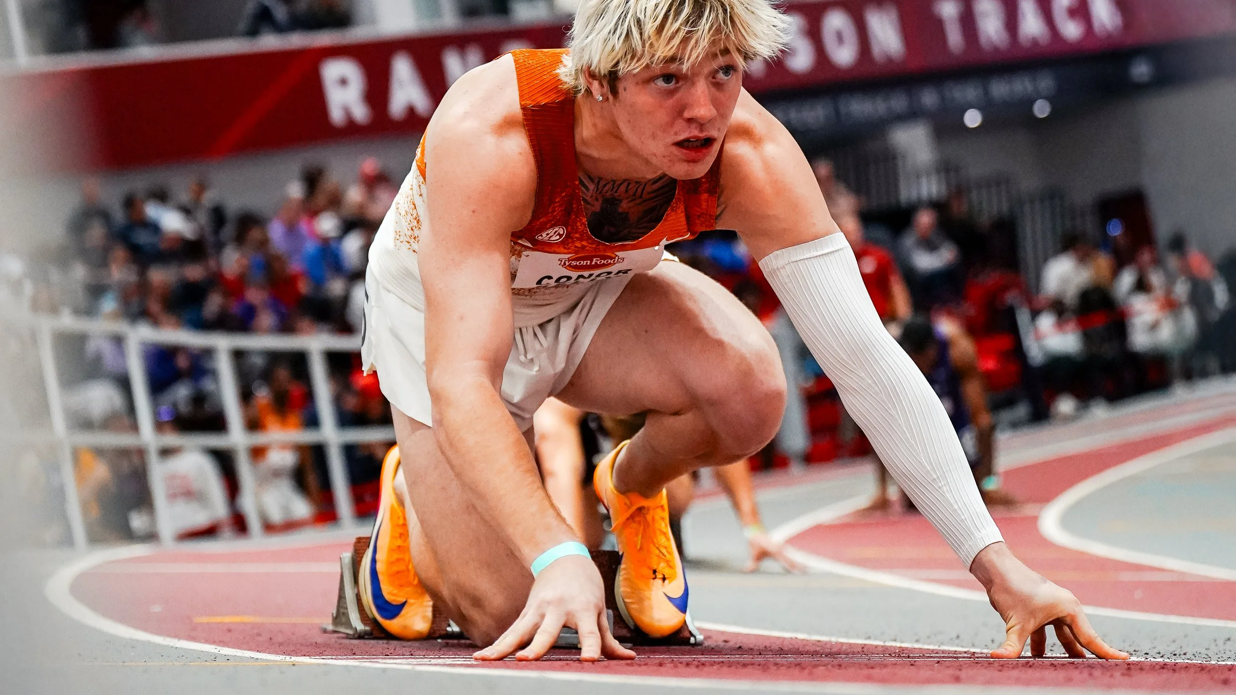 Ramiah Elliott sprints around the curve during the 200-meter prelims race at the SEC Indoor Track & Field Championships on Feb. 27, 2025.